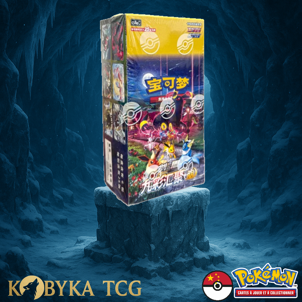 Spécificité(s) : Jumbo boosters (25 cartes), série dédiée aux Évolutions d’Évoli, tirages rares V & VMAX, import chinois exclusif