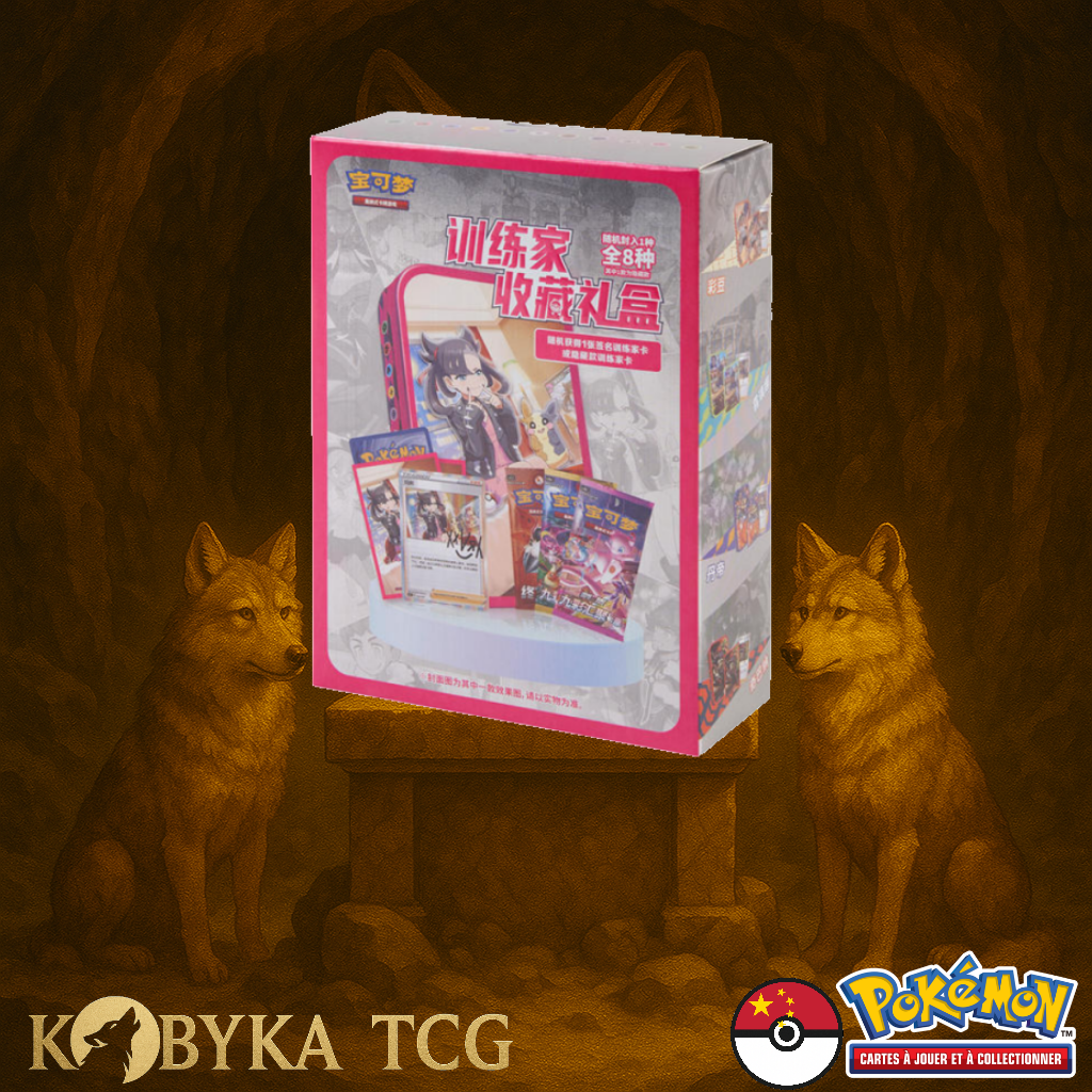 Cette Trainer Collection Gift Box réunit cartes promos, mini tin en métal et protège-cartes aux couleurs de différents Dresseurs, accompagnés de boosters issus des séries chinoises. Un set compact, esthétique et idéal pour les collectionneurs.