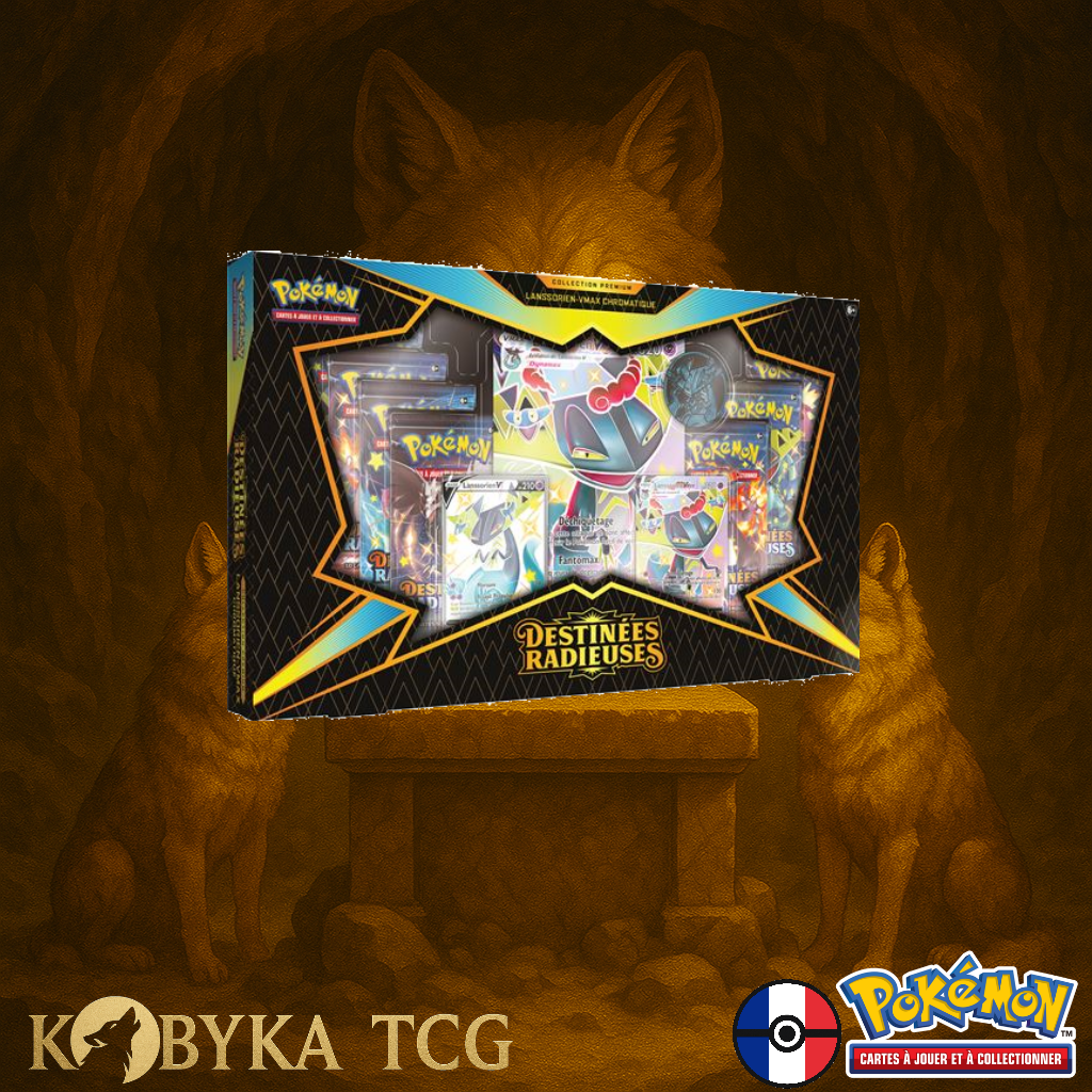 Ce coffret premium te permet d’ajouter à ta collection Lanssorien-V chromatique et Lanssorien-VMAX chromatique, deux cartes texturées sublimes accompagnées d’une grande carte brillante et d’une pièce métallisée exclusive.