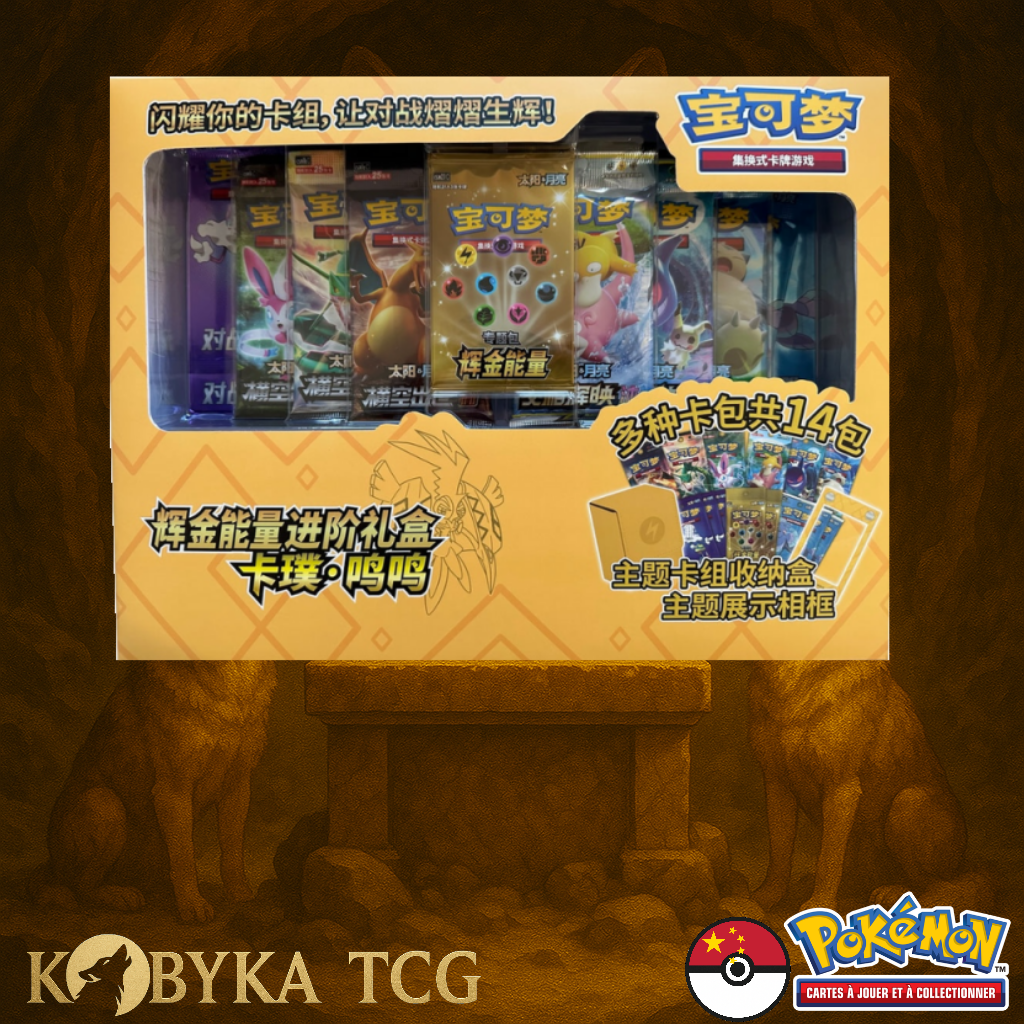 Découvrez le Golden Energy Advanced Gift Box – Tapu Koko, un coffret premium électrisant issu du bloc Soleil & Lune en version chinoise simplifiée. Sorti le 9 septembre 2023, ce set dédié à Tokorico, gardien de Mele-Mele, propose un contenu exceptionnel mêlant cartes dorées, boosters jumbo et accessoires aux couleurs du type Électrique.