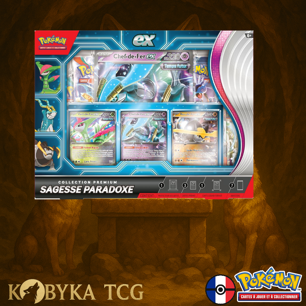 Plongez au cœur de la technologie futuriste avec cette Collection Premium – Sagesse Paradoxe, dédiée aux Pokémon-ex Temps Futur ! Trois puissants Pokémon Paradoxe métalliques — Vert-de-Fer-ex, Chef-de-Fer-ex et Roc-de-Fer-ex — unissent leurs forces pour former un trio stratégique et redoutablement efficace. Parfait pour les collectionneurs amoureux des designs mécaniques et des cartes exclusives.