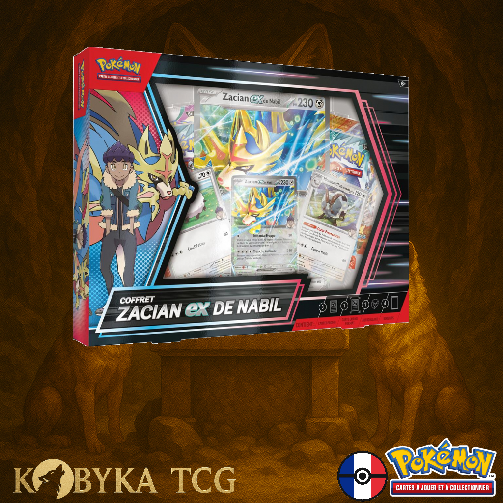 SpĂ©cificitĂ©s : Coffret promo â Zacian-ex thĂ©matique, cartes exclusives de Nabil, carte jumbo
