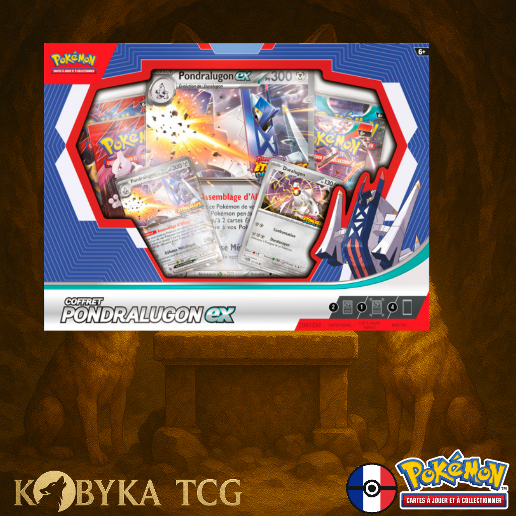 Préparez-vous à libérer toute la puissance d’un géant d’acier draconique avec Pondralugon-ex, accompagné de son évolution emblématique Duralugon ! Massif, résistant et redoutablement stratégique, Pondralugon-ex devient une véritable forteresse mobile capable de renverser le cours d’un combat. Cette collection spéciale propose deux cartes brillantes exclusives et une carte jumbo impressionnante, parfaites pour enrichir votre collection.