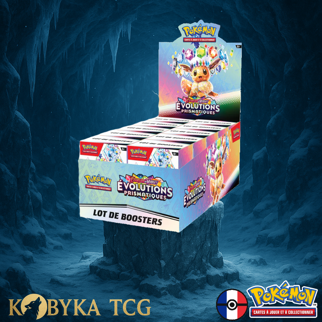 Avec Écarlate et Violet – Évolutions Prismatiques, plongez dans un univers éclatant où Évoli-ex et ses évolutions — Aquali, Pyroli, Mentali, Noctali, Phyllali, Givrali et Nymphali — brillent sous un éclat prismatique exceptionnel.