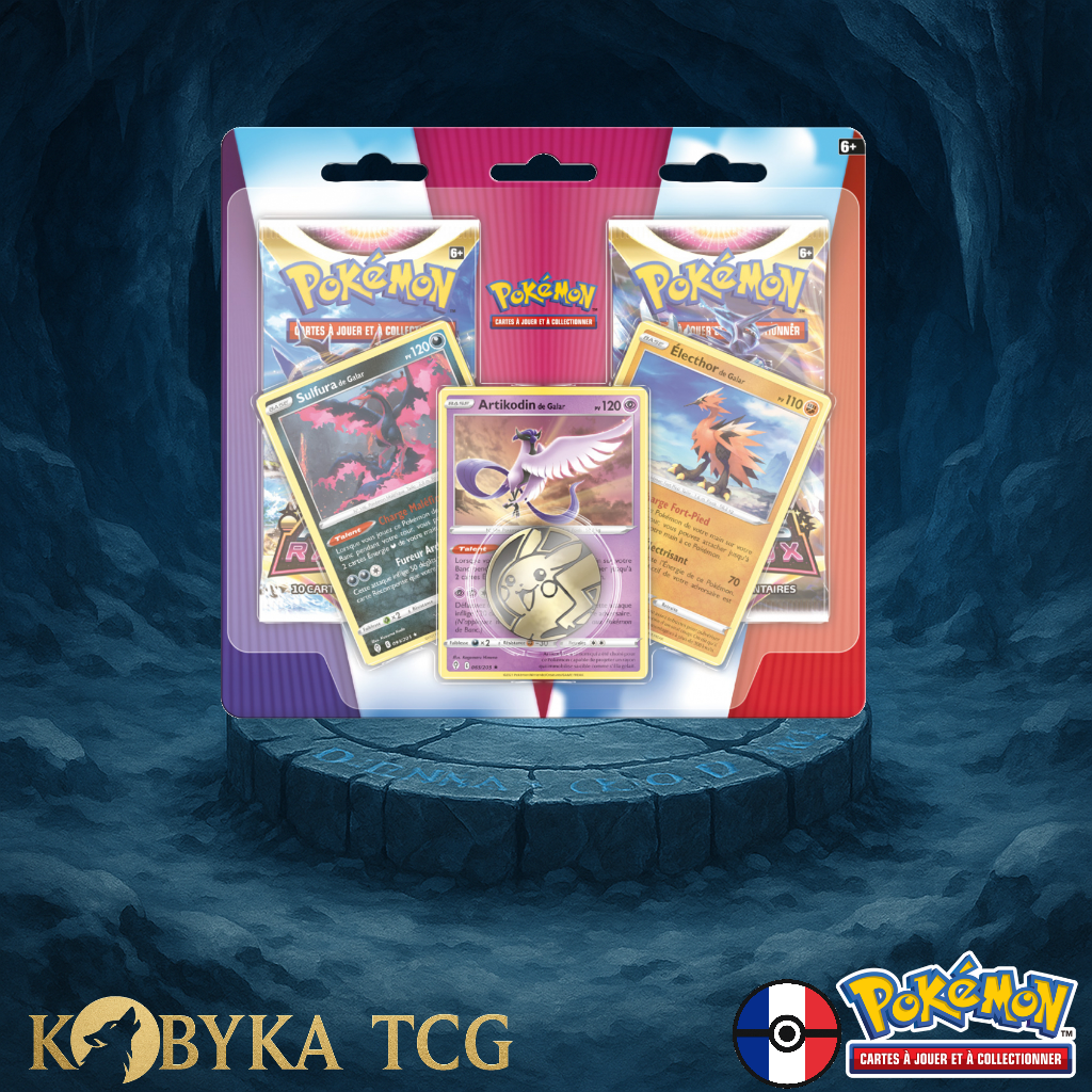 L’extension Épée & Bouclier – Astres Radieux (EB10) met en scène une constellation de Pokémon puissants, et ce duopack réunit trois figures mythiques : Sulfura, Artikodin et Électhor dans leurs formes uniques de la région de Galar.
